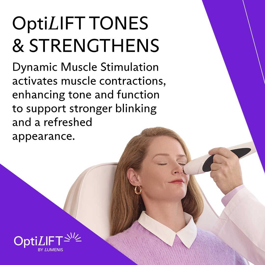 OptLIFT, a revolutionary non-invasive treatment using proprietary Dynamic Muscle Stimulation Technology, targets lower lid laxity and enhances blinking quality and eyelid function, all while delivering a toned and lifted look.